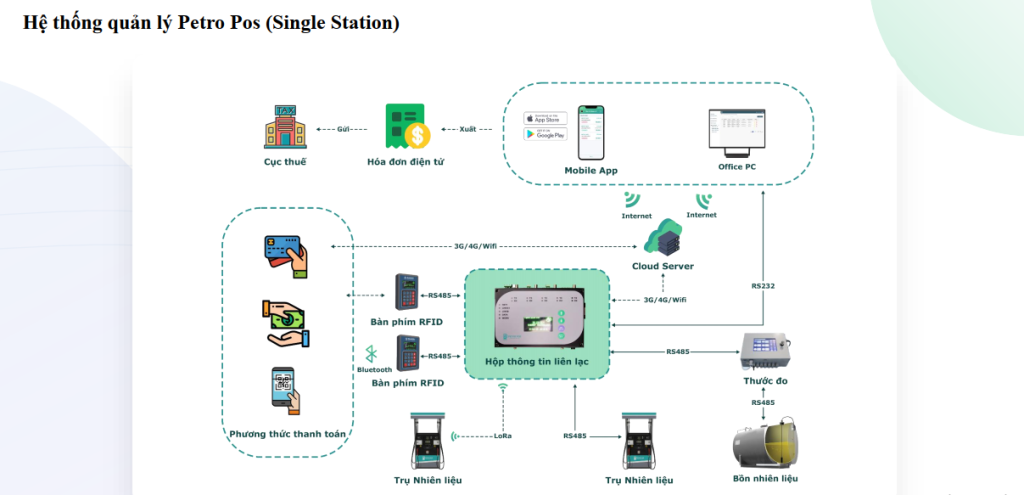 Với trụ bơm có khả năng truyền nhận dữ liệu bán hàng, đơn vị chỉ cần tích hợp phần mềm bán hàng với các giải pháp hệ thống PetroPos xuất hóa đơn.