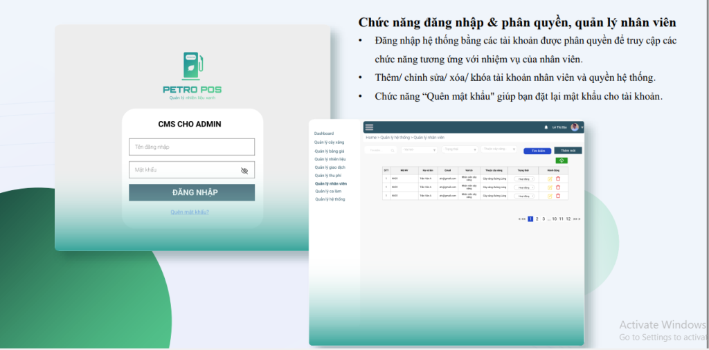 Bao gồm các hệ thống quản lý cửa hàng xăng dầu, cụ thể: quản lý trụ xăng, quản lý nhiên liệu, giao dịch thanh toán, quản lý người dùng, quản lý bán hàng, nhân sự…)
